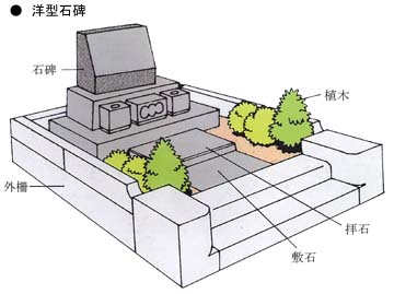 ![]() 戦後一般的になった形です。仏式神式などの宗教にとらわれない碑としての形で、オルガン型墓石とも呼ばれます。 ![]() 最近では家制度のイメージから抜け出したくて、お墓にも自我が色濃く表れてきました。これに伴って、お墓も従来の和式ばかりではなく、洋式様式のものも増え、芝生を敷きつめた西洋式の霊園も多くなってきました。ふだんの生活が西洋化したことから、洋式のお墓にもそれほど違和感を感じなくなったという事でしょう。 なお、お墓は家族のものとはいえ、「○○家之墓」から個人のメモリーとしての志向が強くなりつつあります。「夢」「愛」などの文字だけを刻む石碑もよく見かけることになりました。 |